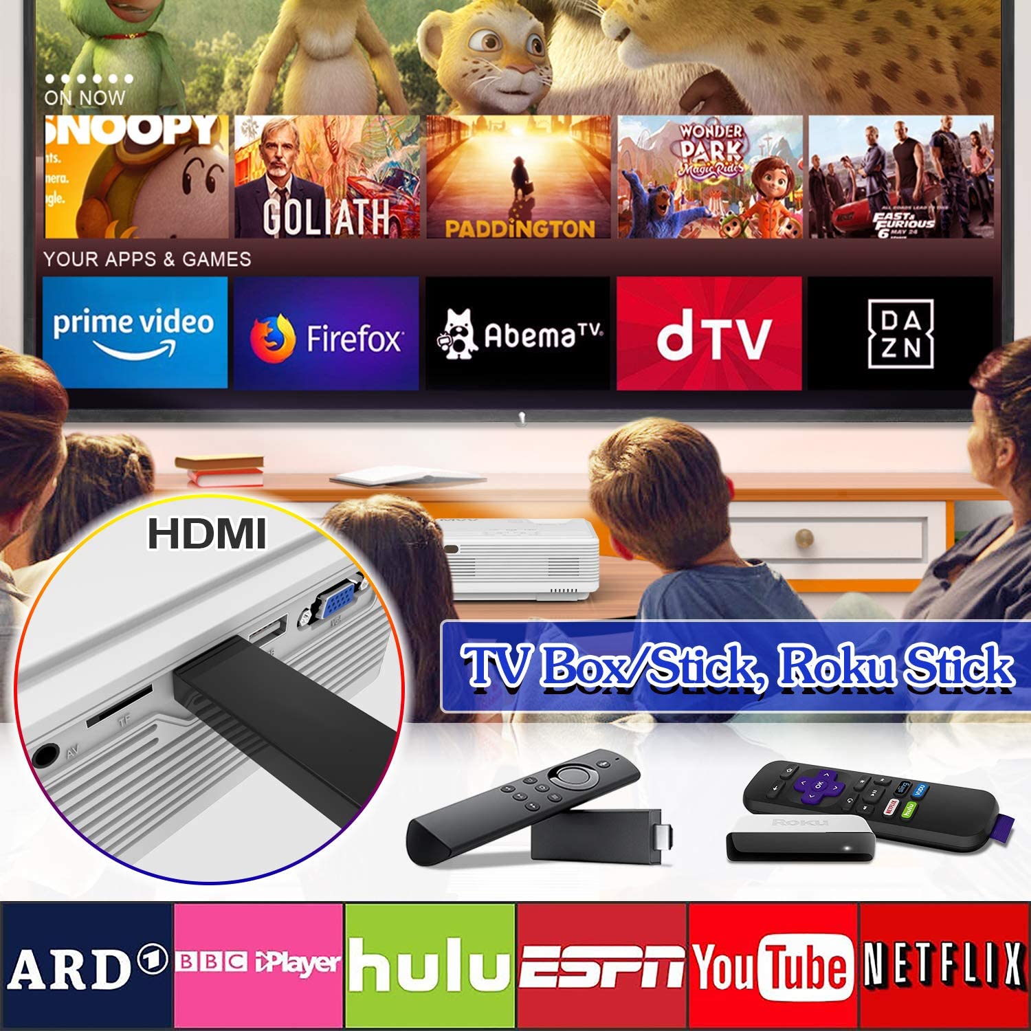 ★ 【Big News 4: All Needed Compatibility and Application】Equipped with HDMI, VGA, AV, USB interfaces, the projector is compatible with TV Box, TV Stick, PCs, Laptops, Tablets, USB Flash Drive, players. It’s supposed to apply many environment—Home Theater, Video Game, Party. You can use it for small meeting in dark room, but it is not a professional office projector for PPT or text. As the copyright, some videos (such as Netflix) can't be played via phone connection (wifi or usb).